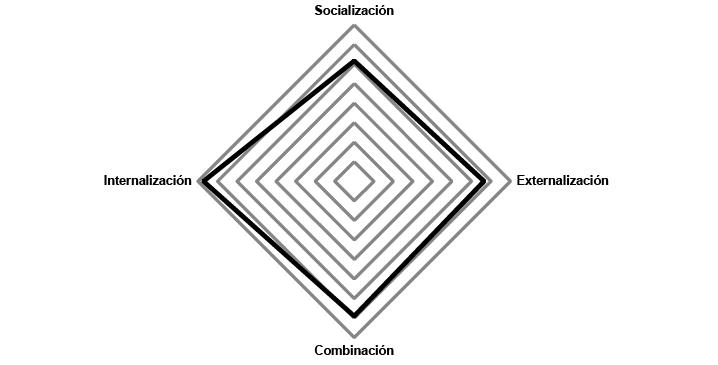 De forma coincidente con Gutiérrez et al. (2015) se observan diferencias en la aportación que cada dimensión hace a la GC, para este caso la dimensión que presenta valores más bajos es la socialización y la dimensión más fortalecida es la internalización (diagrama 1). El ideal sería que las cuatro dimensiones presentaran valores altos, sin embargo, una aportación que hace este trabajo, es precisamente mostrar el desempeño real de la GC de las PYME encuestadas como un preámbulo a cambios importantes al interior y exterior de la organización, de tal manera que adquirir y compartir conocimiento y experiencias sean el despunte para enriquecer y mejorar los procesos de la innovación, y a su vez, lograr tanto un mayor valor añadido a los productos como incrementar el nivel del rendimiento empresarial (García et al. 2019).
