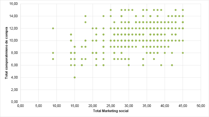 Dispersión entre las variables de marketing social y comportamiento de compra del consumidor.