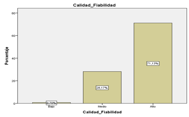 El gráfico 3 representa los datos de la dimensión Fiabilidad en la Calidad de servicio percibida por los estudiantes universitarios, donde el mayor porcentaje se encuentra en el nivel alto con un 71,13 %.