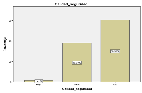 En la tabla 5 la dimensión Seguridad de los 142 estudiantes que representan el 100% se evidencia 86 estudiantes consideran que en la dimensión Seguridad de la Calidad de servicio se encuentra en un nivel alto representado un 60,56 % Además 54 estudiantes se encuentran en el nivel promedio con un 38,03 % y 2 estudiantes lo perciben en un nivel bajo con un 1,41 % en la dimensión Seguridad.
