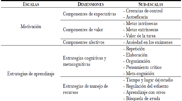 Para Pintrich y DeGroot (1990) se dan tres dimensiones motivacionales: un componente de expectativas, un componente de valor y un componente afectivo. Respecto a las estrategias de aprendizaje consideran relevantes dos aspectos: Las estrategias cognitivas que los sujetos emplean para entender, aprender y recordar la materia de estudio, las Estrategias meta-cognitivas para planificar, dirigir y modificar el funcionamiento cognitivo, y las Estrategias de control o manejo de recursos disponibles, cada uno con sus sub-escalas. (Cuadro 1).