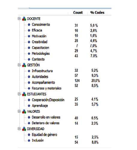El análisis cuantitativo de las preguntas abiertas permitió identificar los factores clave y emergentes de las respuestas, tomadas como unidades de análisis (palabras), y fueron caracterizadas y ubicadas dentro de una categoría central.