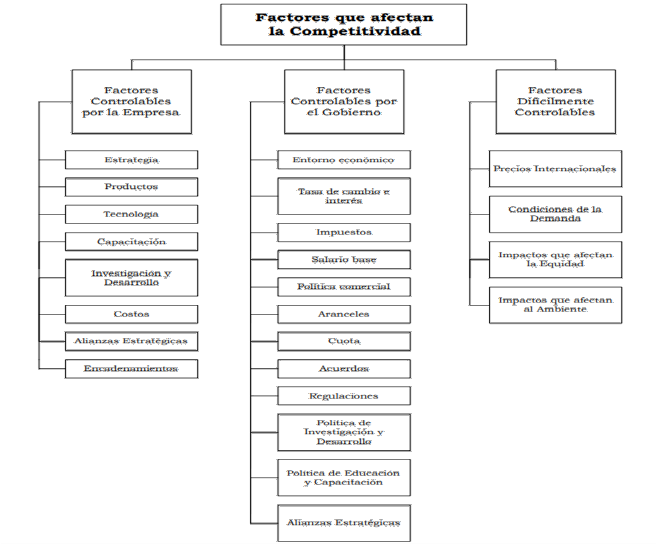 Teniendo en cuenta lo anterior, Rojas, Romero, y Sepúlveda (2000), identifican un marco metodológico para medir la competitividad, ofreciendo un esquema de referencia analítico para servir de apoyo al proceso de toma de decisiones de los agentes públicos y privados donde se organizan los factores dentro de tres grupos, según quien los controle: la empresa o el gobierno y aquellos difícilmente controlables (Figura1).