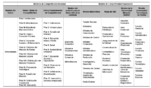 En el caso de las PYMES objeto de estudio se usó el Modelo de la Universidad Tecnológica de Pereira, propuesto por Castaño & Gutiérrez (2011), donde se exploran ocho aspectos o funciones de la firma, que se indagan mediante la aplicación de un cuestionario de 125 preguntas, este modelo es el que más se adapta a las condiciones del contexto real de las PYMES y región estudiadas donde se analizan los factores de competitividad en PYMES manufacturaras en Colombia, para lo cual se construye un índice sintético de competitividad. Es importante destacar que las PYMES para afrontar con éxito las condiciones en un contexto mundial globalizado y aperturista, requieren poseer un alto nivel de competitividad.
