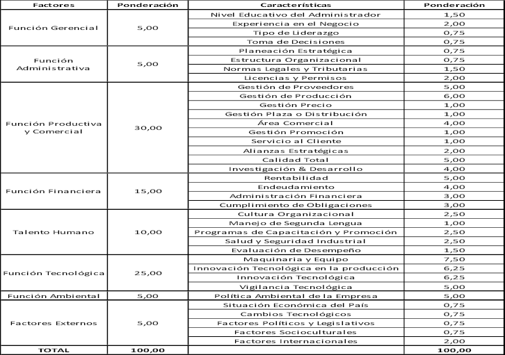 En el cuadro 1, se evidencian los factores que se consideraron para la medición del nivel de competitividad de las PYMES manufactureras de Colombia, los cuales fueron ponderados, y por cada factor, se mide las características correspondientes también ponderadas, de tal modo que se pudieran obtener datos para generar las interpretaciones y análisis de la realidad competitiva de las empresas objeto de estudio. Cada uno de los elementos que se perciben en este cuadro permitió elegir los factores pertinentes y ajustados a la realidad del contexto de estudio, los cuales, fueron: Función Gerencial, Función Productiva y Comercial, Función Administrativa, Función Financiera, Función Ambiental, Talento Humano, Factores Externos y Función Tecnológica, todo esto, para la construcción del índice sintético, el cual, va de cero a 100,00 puntos como nivel máximo de cumplimiento; esto se midió por cada factor, cada uno de estos, tenía unas características, para las cuales, se midió el nivel de cumplimiento, de acuerdo a lo respondido por las firmas en la encuesta en cada una de las pregunta - asociada a cada una de estas características -, todo esto, fue ponderado, y luego esto se agregó de forma simple en una sumatoria, por cada PYME, y se promedió para cada sector.