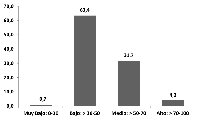 De acuerdo con los resultados obtenidos en el estudio, el 63,4% de las firmas manufactureras en Sincelejo presentan un nivel de competitividad bajo, mientras que solo 31.7% se ubican en niveles medio y apenas un 4,1% presenta un resultado superior, que las ubica con alto nivel de competitividad (ver gráfico 1).