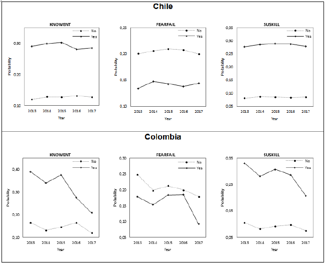 De acuerdo con los resultados, se puede visualizar para ambos países, que las probabilidades de convertirse en emprendedor para aquellas personas que declaran no conocer emprendedores/no tener redes (knowent), no poseer las capacidades (suskill) y tener riesgo de fracasar (fearfail) son bastantes más bajas que sus recíprocas. El poseer esta competencia hace aumentar la probabilidad de involucrarse en actividad emprendedora inicial. Las probabilidades se aprecian bastante más estables para Chile que para Colombia. Hecho que se pudiera explicar posiblemente por las condiciones de estabilidad social y económica de Chile para aquellos años de estudio. Si el análisis se hiciera para los años 2020 y 2021, probablemente estos indicadores cambiarían mucho producto del estallido social en el caso de Chile (fines 2020) y actual pandemia, para el caso de ambos países.