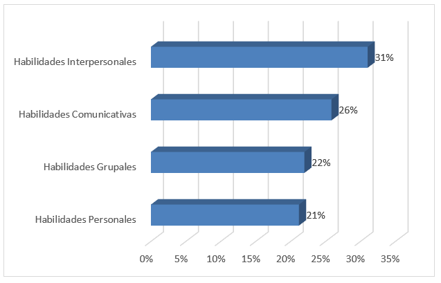 Como se observa las habilidades interpersonales con un 31% es la más prevalente (gráfico 2) en la población encuestada, le sigue las habilidades comunicativas con un 26% y las grupales y personales con un 22% y 21% respectivamente.
