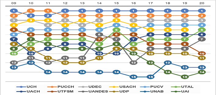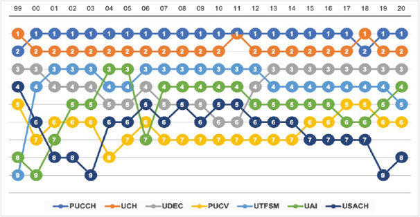 A pesar de los cambios en los criterios, la PUC se ha situado mayormente como la líder de esta medición, (en 19 ocasiones); a su vez, la UCH ha sido la única en superar a la mencionada, pudiendo hacerlo en tres oportunidades, eso sí, la ha secundado en el resto de ediciones. Las mayores variaciones posicionales la han sufrido las UAI y USACH: la primera pasó de estar en el puesto nueve en el año 2000, a ser tercera en los años 2004 y 2005, un ascenso de seis lugares en un transcurso de cuatro ediciones; mientras que la segunda se encontraba en la ubicación número cuatro para el año 1999 (su mejor desempeño en la medición) hasta descender al puesto nueve en 2019.