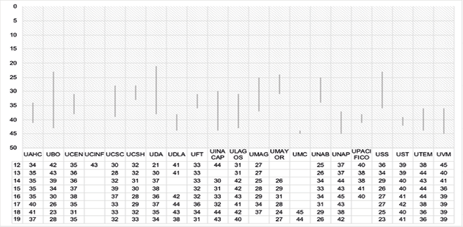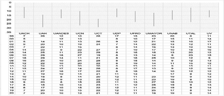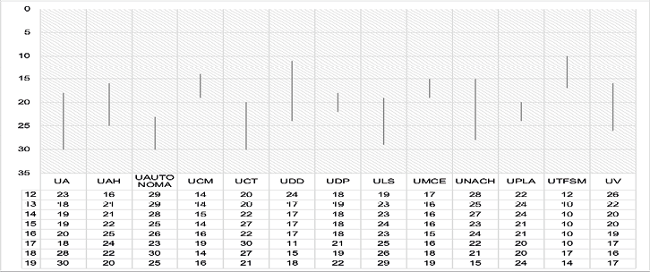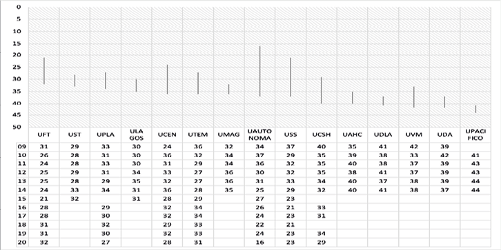 La información sobre las posiciones y recorridos que han tenido las 19 casas de estudio se pueden comprobar en la figura 3. Queda en evidencia que en este grupo comienzan a mostrarse instituciones con una alta diferencia entre su mejor y peor posición, siendo la UDD la que ha recorrido de forma más abrupta parte del listado, con una disparidad de 30 puestos (del 39 al 9); otros casos serían las universidades UGM y UTA (28 y 27 respectivamente).
