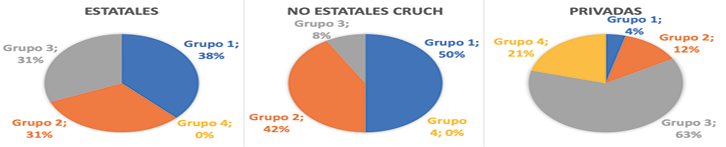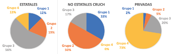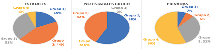También se detectó que el porcentaje de participación por tipo de universidad en cada grupo fue la siguiente: las universidades estatales, en promedio, participaron mayoritariamente entre el tercer y segundo grupo, con un porcentaje del 39% y 31% respectivamente; las instituciones no estatales pertenecientes al CRUCH se ubican mayoritariamente entre el primer y segundo grupo (47% y 45% respectivamente), sólo el 8% se ubica en el tercer grupo; finalmente, las universidades privadas se concentran mayormente en el cuarto grupo, con un promedio de 50% de participación (tercer grupo 38%, segundo grupo 8% y primer grupo sólo el 4%).