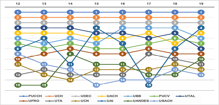 Cabe mencionar que desde el 2013 a la fecha, las universidades UACH, UANDES y UTAL se han mantenido dentro de las 10 primeras del país, exhibiendo un buen desempeño en los criterios propuestos para ese periodo. Ahora bien, en términos de variaciones posicionales, los recorridos más significativos las tienen las universidades UCN y UTAL, con una diferencia de 17 puestos entre su mejor y peor posición (la primera pasó del lugar 10 al 27, mientras que la segunda recorrió desde el puesto 6 al 23), coincidentemente ambas para los años 1999 y 2006. Por último, la UV es la institución que menos posiciones ha recorrido entre las que integran el grupo, pasando de la ubicación 17 (en 2001) al 9 (en 2007), una diferencia de ocho puestos.