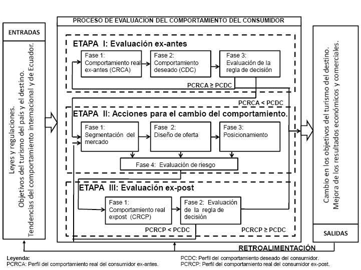 Las entradas del modelo están constituidas por las leyes y regulaciones del turismo en el país, los objetivos de desarrollo del turismo y las tendencias del comportamiento del consumidor internacional y de Ecuador. Una vez analizadas las mismas se pasa al proceso de evaluación del comportamiento del consumidor conformado por tres etapas.