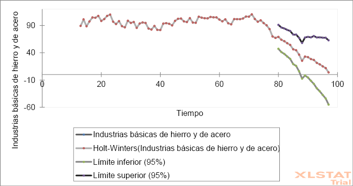 El gráfico 1, demuestra la tendencia a un repunte en el índice de producción mensual para el sector de industrias básicas del hierro y el acero a 84.627 en julio de 2020. La línea de Holt-Winters predice una caída en el índice a 26.790 para julio de 2021 de seguir el mismo patrón de comportamiento durante la pandemia. Las líneas que indican el límite máximo y mínimo, es decir, el mejor y el peor escenario. En el mejor de ellos se estima para enero de 2022 un índice de producción para el sector de 62.728.