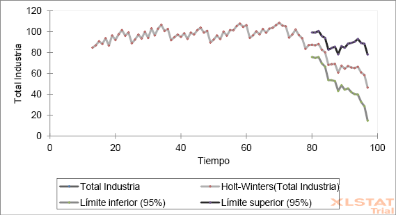 Se tasaron tres series exponenciales simples no dependientes de nivel, tendencia y estacionales. Son interdependientes en el sentido de que los tres componentes deben actualizarse cada período (Preslav et al, 2018). En el estudio se partió del histórico de variación de índices de producción del sector metalmecánico para la República de Colombia con proyección de 18 meses hacia adelante y comprender los factores que afectan la productividad y competitividad de sector industrial metalmecánico (López, 2016)