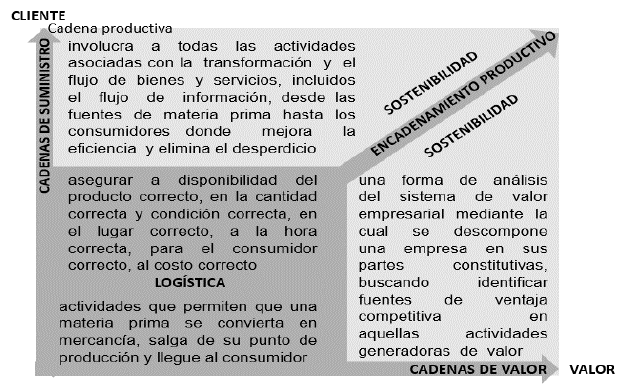 La relación entre valor producido y valor percibido constituye la esencia de la dinámica competitiva y confiere a la cadena de valor una gran utilidad para el análisis estratégico, algo similar a lo abordado en las cadenas de suministro con el servicio al cliente. Con base en lo mencionado anteriormente, la cadena de valor de ninguna manera debe ser confundida con la cadena de suministro pues ambos conceptos son muy diferentes entre sí, aunque muy complementarios, es más, se puede decir que una cadena de valor preexiste en una cadena de suministro. Como principal semejanza se tienen que ambas engloban la logística o cadena interna de suministro, ambas se basan en el encadenamiento, por lo que es hora de abordar el termino de encadenamientos productivos, este concepto se define según los autores de este artículo como la alianza entre organizaciones de distintos sectores que aprovechan las oportunidades mediante la contratación efectiva sobre la base de acuerdos que engloban las actividades logísticas de la producción de un bien o un servicio. En el diagrama 1 se muestra la relación de estos términos, se evidencia a la logística como elemento base en un encadenamiento que presenta características propias de la cadena de suministros y cadena de valor, con un enfoque sostenible evidenciado por un impacto social, económico y medioambiental.