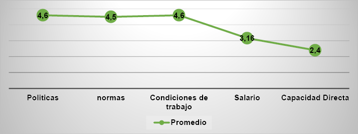 El factor norma alcanzó un promedio de 4,5, y se consideró que la fundación tiene establecidas las nomas para la atención al usuario, además el empleado asiste puntualmente a sus actividades laborales, y existen normas para la atención al usuario. Generando una tendencia hacia el hecho de que existen normas como un factor higiénico de satisfacción. Con relación a esto, Newstrom (2011) afirma que, al adoptarse profesionalmente, estas conductas contribuyen al logro de un merecido ascenso, además de dar pautas a los altos directivos respecto a los méritos de una propuesta, que signifique el incremento de las responsabilidades y capacidades individuales.