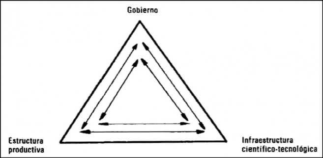 Por su parte, desde los aportes realizados por Sábato y Botana recurren en su análisis a una representación de la realidad construyendo un modelo de relaciones ideales deseables para impulsar la innovación científico-tecnológica entre tres actores fundamentales (gobiernos, estructura productiva e infraestructura cientifico-tecnológica). Un modelo con alta complejidad, aunque prescindiendo del análisis histórico.