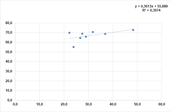 El coeficiente de correlación entre ambas variables es Corel (X,Y)=0,554455861, lo que indica que la correlación entre ambas variables es directa, pero no es lo suficientemente fuerte para poder llegar a ser concluyente con la afirmación que entre mayor capital extranjero que ha llegado al industria creativa, mayor ha sido el desarrollo de estas y por lo tanto mayor aporte al PIB. Sólo podría afirmarse que hay una influencia del aporte que hace el capital extranjero sobre dicho sector en su desarrollo, por lo que se necesita entonces investigar sobre otros posibles factores que han propiciado su desarrollo.