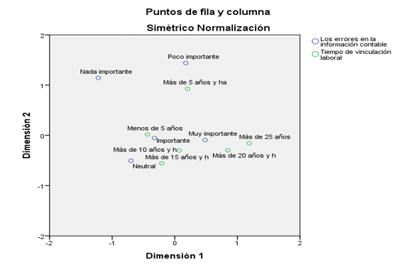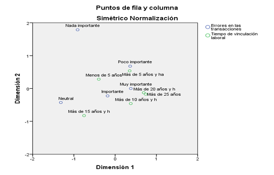 A continuación, se presenta un análisis de correspondencias simples y la normalización simétrica para los diferentes resultados obtenidos en la tabla 3. En primera instancia, se resalta que entre las dos primeras dimensiones de la información agrupada existe una contribución a la inercia total superior al 80.0% sustentando que las dependencias observadas están adecuadamente recogidas, y comprobando así que las variables no son independientes (Sánchez-Sellero et al, 2018). Con el desarrollo del método de Normalización simétrica se identificaron y analizaron las semejanzas y diferencias entre el tiempo de vinculación laboral de la población estudiada frente a los riesgos operacionales.