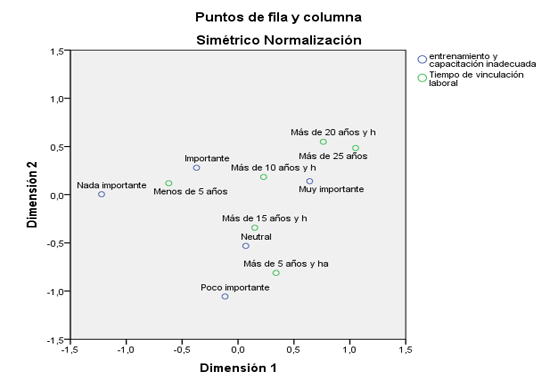 Análisis de correspondencias simples entre el tiempo de vinculación laboral de la población estudiada y el entrenamiento y la capacitación inadecuados