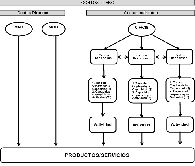 TDABC plantea que los recursos no son asignados directamente a las actividades, sino que requiere de un proceso previo de distribución primaria y secundaria entre los centros de responsabilidad de la organización para desde allí y basado en el tiempo efectivo de trabajo, usando como base ecuaciones de tiempo, asignar el costo a las actividades y finalmente llegar al producto o servicio (diagrama 1).