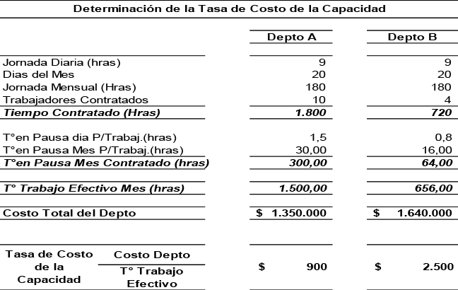La determinación de la tasa de costo de la capacidad es también posible de obtener por centro de responsabilidad [CR], donde el numerador corresponde al tradicional costo de conversión de cada CR y el denominador al tiempo efectivo de trabajo realizado en cada CR, previa identificación y descuento del denominado tiempo en pausa al tiempo contratado o disponible de los recursos suministrados.