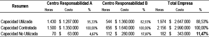 El nivel de capacidad utilizada en el conjunto de la organización producto de la ponderación de todos los centros de responsabilidad es de un 88.53%, por tanto, la capacidad No utilizada sería de un 11,47% que equivale a la cifra a medir, controlar, gestionar y mejorar.