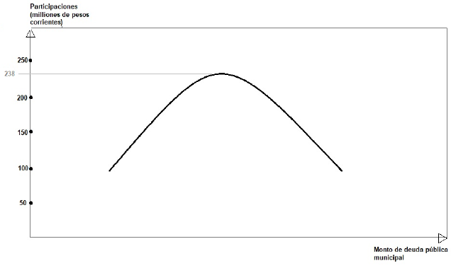 En lo que refiere a la variable , las participaciones federales como factor de cambio tiene un impacto negativo en el aumento de la deuda de los municipios del Estado de Jalisco. Por lo que, la H2: se confirma debido a que el envío de participaciones genera un efecto positivo en el aumento de la deuda siempre que no rebase el punto de inflexión ($238,000,000) como se ilustra en la figura dos.