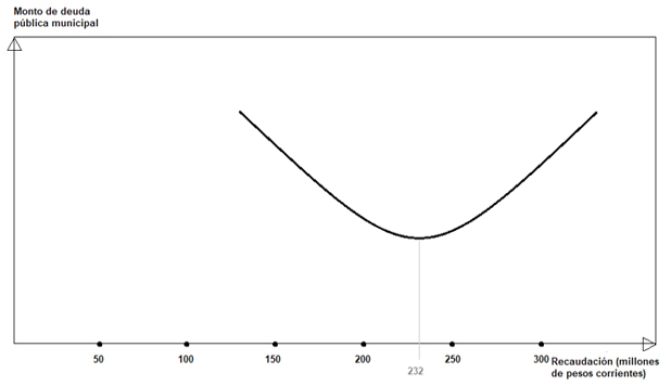 Por lo que se puede asumir que el incremento en la recaudación, pasando el umbral de los $ 232,000,000 (aproximadamente), generaría un efecto positivo en la deuda (figura 1).