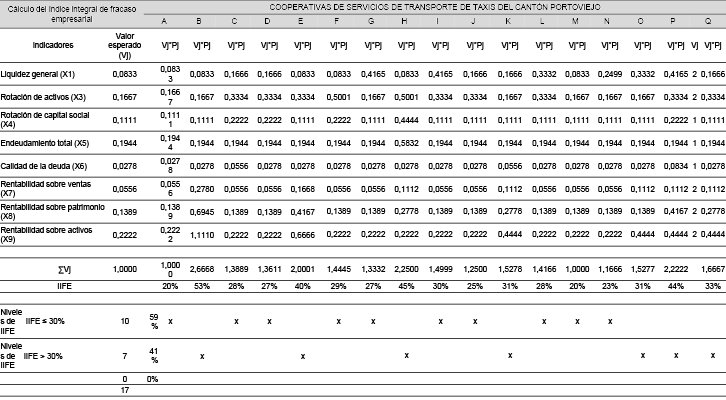 Como siguiente paso, hay que emitir una calificación para cada indicador (Pj) de las 17 cooperativas estudiadas, en este caso se utilizó como medida de tendencia central la mediana de dichos criterios, para que sirviera como referencia según plantean Nogueira et al, citado por Leyva, (2014). Para dicho cálculo se hizo necesario utilizar una vez más el programa estadístico SPSS v.25. Con ambos componentes calculados solo resta aplicar la formula “Índice integral de fracaso empresarial” (IIFE) y obtener los resultados para la muestra investigativa. Los cuales se presentan a continuación: