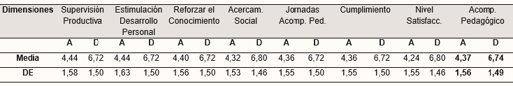 Se destaca un aumento en las puntaciones de las medias para cada dimensión de las variables: Desempeño Docente 4,45/6,63 (Planificación 4,40/6,64; Ejecución 4,56/6,64; Competencias Complementarias 4,40/6,60). Acompañamiento Pedagógico 4,37/6,74 (Supervisión Productiva 4,44/6,72; Estimulación al Desarrollo Personal 4,44/6,72; Reforzar el Conocimiento 4,40/6,72; Acercamiento Social 4,32/6,80; Jornadas de Acompañamiento Pedagógico 4,36/6,72; Cumplimiento 4,36/6,72; Nivel de Satisfacción 4,24/6,80 (Tabla 1).