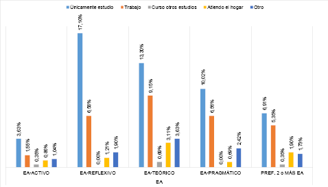 Sin duda esta preferencia entre los EA no coincide con los resultados del estudio realizado por Gómez-Terán et al, (2019) donde el EA de preferencia de los estudiantes es el Activo manteniéndose en una preferencia entre alta y muy alta, dejando al EA-Reflexivo con una tendencia de baja a muy baja. Otro estudio similar fue la realizada por Maureira et al, (2015), hallando que existe una correlación positiva leve entre el EA Teórico con el RA y el EA Activo tiene una correlación negativa leve, los otros dos estilos no presentan relaciones.