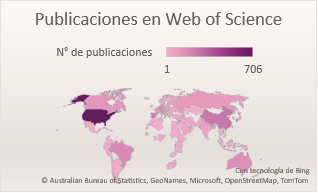 Si se analizan los top-ten a nivel agregado de productividad por países, se constató que en Scopus ellos representan el 73% de todos los artículos publicados y en la Web of Science ello llega al 81%, la producción científica no se concentra solamente en una región geográfica (Figura 1), sino que se observan registros de publicaciones en variados puntos del planeta, siendo los que más aportan Norteamérica, Europa, parte de Asia y Oceanía.