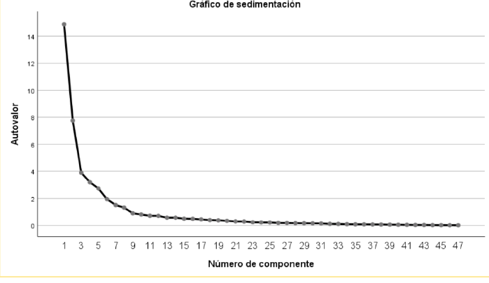 Por lo tanto, una prueba KMO del 0,768 con un nivel de significancia menor a 0,05 es pertinente (Patlán, 2016). La varianza total explicada de la variable dependiente es del 68,94%. La matriz de componentes rotados determina la reducción a 47 ítems. De esa forma, los 70 ítems eliminados corresponden a valores absolutos iguales o menores a 0,6.