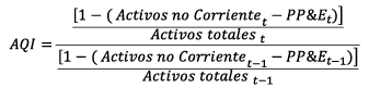 Índice de calidad de activos [AQI] mide la calidad de los activos mediante la relación entre los activos no corrientes distintos de la propiedad planta y equipo y los activos totales de un año con relación a otro. El aumento de AQI con relación al año anterior, puede indicar una mayor propensión a activar gastos y de esa forma diferirlos. Es de esperar una relación positiva entre el AQI y la probabilidad de manipulación de los resultados (Terreno et al, 2020).