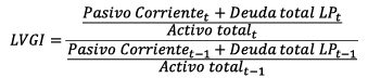Índice de apalancamiento [LVGI] mide el apalancamiento describe la estructura financiera de una empresa. La disminución de los niveles de endeudamiento para no incumplir con los contratos de deuda o mostrar un menor riesgo de insolvencia (Terreno et al, 2020).