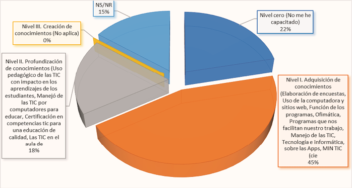En este sentido el gráfico 1, describe la profundización que tienen los docentes en competencias TIC a partir de la preparación cognitiva de los encuestados. Como resultado, se identificaron dos niveles de preparación cognitiva de los encuestados y considera los conocimientos adquiridos de competencias TIC para docentes de la UNESCO (2019). Un primer grupo que está representado por un 45% de los docentes encuestados de las instituciones educativa del municipio Teorama, que se encuentra en un nivel I (adquisición de conocimiento). Mientras que un 18% poseen un nivel II, lo cual se podría catalogar en profundización de conocimiento sobre las TIC. El resto, un 15,0% no respondió y un 22% se encuentran sin.