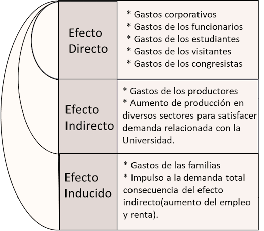 Los efectos directos se derivan de la adquisición de bienes y servicios en los diferentes sectores económicos de la región. Corresponden a los montos que invierte la universidad para su funcionamiento: salarios, compras e inversiones, el gasto de los funcionarios y los alumnos que se trasladan a estudiar, los gastos de los participantes en seminarios, congresos, etc., y los consumos de las familias que viajan a visitar a sus hijos a la ciudad en la cual se emplaza la universidad (Torres et al, 2010; Benito et al, 2018; Valero y Van Reenen, 2019).