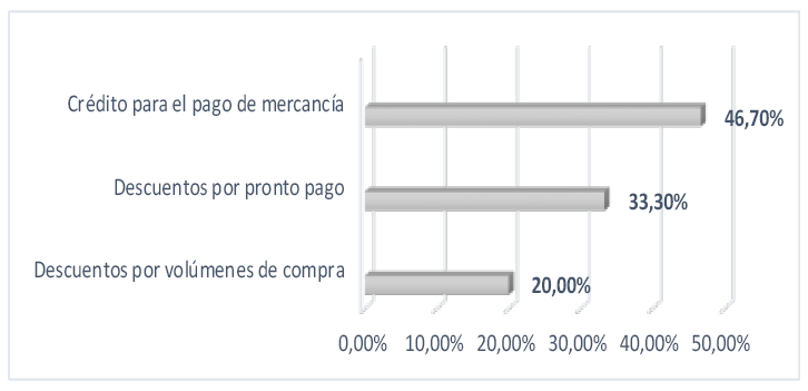 El 33,30% de las entidades aprovechan descuentos por pronto pago y otro 20% los descuentos por volúmenes de compra, también frecuentes en las micro, pequeñas y medianas empresas como refiere Escorcia y Rodelo (2018), todo dependerá de las condiciones establecidas entre el proveedor – cliente en cuanto a porcentaje de descuento, el tiempo límite a cancelar para disfrutar de la rebaja y el stock de materia prima que se pueda facturar.