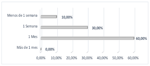 En cuanto al tiempo aproximado que otorgan los proveedores para el pago a crédito de la mercancía, las unidades económicas reportan a través del gráfico 6, que a más de la mitad (60%) se les concede un mes y el resto debe cancelar en una semana (30%) o menos (10%). Condiciones dadas en el sector según expresa Logreira y Bonett (2017), donde para el caso de las microempresas se concede menos tiempo por su baja capacidad de pago y escasos volúmenes de facturación.