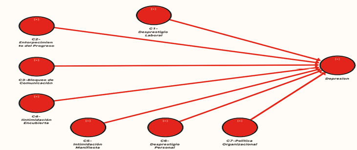 Para este modelamiento y con respecto a la segunda escala de medición (CAPT), solo se utilizó la conducta 8 (C8) denominada política organizacional, ya que las conductas 7 y 9 ya se encuentran expresadas en la escala de “Leymann Inventory of Psychological Terrorization” lo cual originaria duplicidad de ítems (criterio del investigador). Ahora con respecto a la segunda variable denominada: “Depresión” aparece Retamal (1998) quien alude que esta condición es un conjunto de estados de ánimo o emociones que afectan la capacidad reactiva y operativa del ser humano; es decir la depresión vuelve vulnerables emocionalmente a los seres humanos y lo envuelve en estados de tristeza y decaimiento constante.