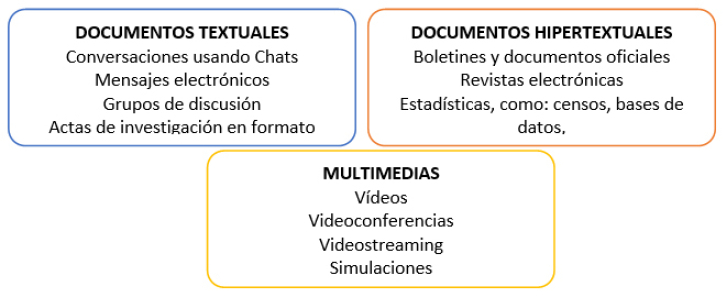También se cuenta con gran cantidad de recursos que ya venían creciendo en los últimos años, como el caso de blogs, vlogs, vídeos, documentos e imágenes publicados en redes sociales, chats y foros de sistemas de educación a distancia, entre otros, los cuales en esta época tenida un desarrollo y producción exponencial. De hecho, muchos investigadores han dejado de ser incognitos al mostrar sus conocimientos a través de las redes.
