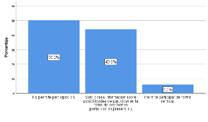 Según el Gráfico 3 podemos apreciar que el 52.2% de las municipalidades no permiten la participación de sus ciudadanos, el 43.9% solo posee información sobre posibilidades de participar en la toma de decisiones de forma presencial y solamente el 6% de las municipalidades permite participar a sus ciudadanos de forma remota. La amplitud de participación en una sociedad democrática debe ser promovido por los líderes gubernamentales como práctica común de la cultura organizacional y cuanta mayor información transparente se difunda, más eficaz será la toma de decisiones cualquiera sea el medio de comunicación más efectiva y accesible.