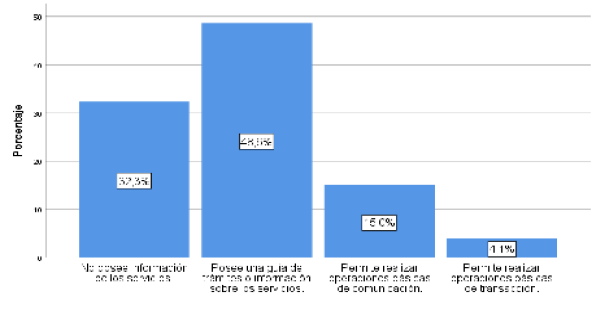 En el Gráfico 6, se muestra que el 32.3% de las municipalidades no poseen información sobre los servicios que brindan, el 48.6% poseen una guía de trámites o muestran información sobre los servicios que brindan, el 15% permiten realizar operaciones básicas de comunicación y el 4.1% permiten realizar operaciones básicas de transacción. La prestación de una adecuada calidad de servicios requiere la formulación, promoción y difusión de un manual de usuarios para que la ciudadanía conozca los servicios que presta la municipalidad y también los procedimientos en formatos visuales simples o flujogramas que orienten el adecuado seguimiento en unidades orgánicas y especificación de los plazos de cumplimiento.