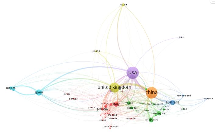 Otra alianza significativa es la que ocurre entre los nodos representados por Pakistán, Malasia, Indonesia y Australia, que, aunque sus nodos evidencian una intensidad menor, sus trabajos están impactando la región de Asia-Pacífico. Así mismo, resalta una colaboración incipiente y con intercambio entre investigadores y universidades de Italia, Alemania y Rusia, en la región europea que, aunque no del tamaño de los líderes, ocurre en su región de interacción local socioeconómica, en este sentido a nivel latinoamericano cobra relevancia la colaboración entre los nodos representados por México, España, Brasil y Portugal, que a su vez tienen enlaces con los principales nodos directa o indirectamente. Es conveniente mencionar la presencia de una fuerte autoría transnacional, pues los mencionados países de cada nodo se ubican a través de 4 continentes, y constituyen en efecto una integración de diferentes perspectivas y corrientes académicas.
