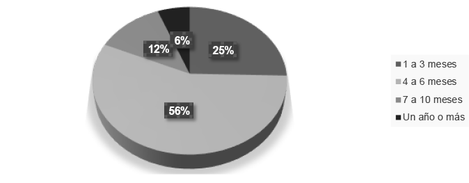 El tiempo de estadía de los alumnos en los NAF ecuatorianos es en mayor medida de 4 a 6 meses en un (56%), como se observa en el Gráfico 3.