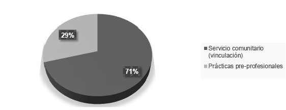 De acuerdo con la normativa que rige la educación superior los alumnos además de aprobar los créditos (materias, deben cumplir horas específicas de vinculación y prácticas preprofesionales. Los NAF les dan la oportunidad de cumplir con estos requisitos de educación, en el grupo de estudio se puede precisar que del total de alumnos que ingresan a los NAF al menos el 71% desempeña el servicio comunitario (vinculación) y el 29% prácticas preprofesionales, como se aprecia en el Gráfico 4.