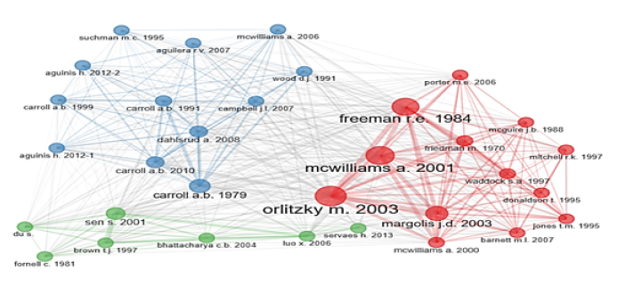 Los clusters que se presentan en el diagrama 2 concuerdan con las tendencias teóricas que siguen los autores, en las que se destacan la teoría de la agencia (Amagoh, 2009; Bohren, 1998; Jensen y Meckling, 1976; Mcwilliams y Siegel, 2001; Reverte, 2009; Shankman, 1999); teoría de stakeholders en donde analiza la interacción de los grupos de interés y las acciones de la empresa (Bingham et al, 2005; Fassin y Gosselin, 2011; Freeman, 1994; Freeman y McVea, 2001; Melle, 2007; O’Riordan y Fairbrass, 2014; Phillips, 2004), la teoría de legitimidad que sostiene que las acciones de la organización deben ser reconocidas por sus grupos de interés (Reverte, 2009; Suchman, 1995; Williamson y Lynch-Wood, 2008) y la teoría basada en los recursos y capacidades en donde mencionan que la generación de estrategias basadas en el conjunto de recursos y capacidades internas de la empresa conllevan a ventajas competitivas (Atakan y Eker, 2007; Bowen, 2007; Porter y Kramer, 2006).