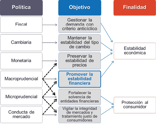 Debe enfatizarse que, el marco de política orientado en promover la estabilidad financiera involucra diversos instrumentos hacia propósitos fundamentales como la estabilidad económica y la protección del consumidor, las cuales, a su vez, se sustentan en diversos tipos de políticas (fiscal, monetaria, macroprudencial, microprudencial y conducta de mercado). Entonces, queda claro que ninguna de estas políticas de manera aislada podría alcanzar la estabilidad financiera.